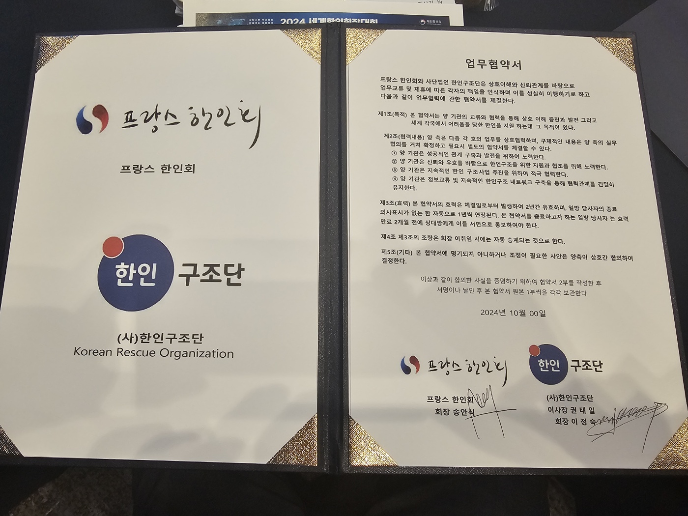 프랑스 한인회는 2024년 10월 한인구조단과 업무 협약을 맺었습니다.