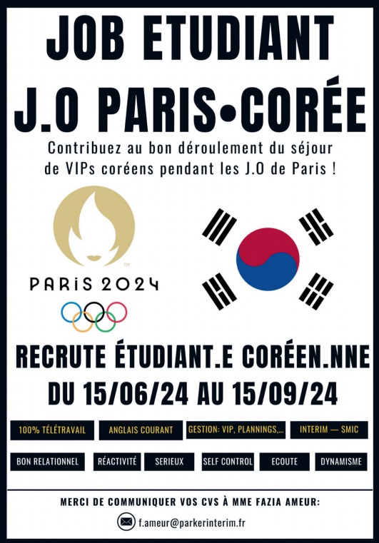 Nous recherchons aussi des étudiants coréens (bilingue coréen) parlant anglais ou français couramment pour un job dans le cadre des Jeux olympiques