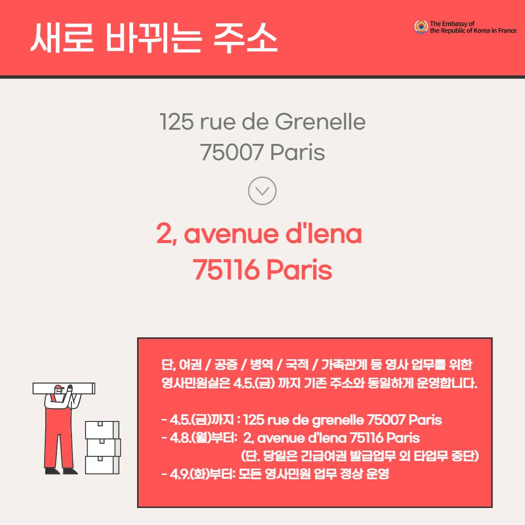 2. 영사민원실 새로운 주소: 2, Avenue d'Iéna, 75116 Paris
