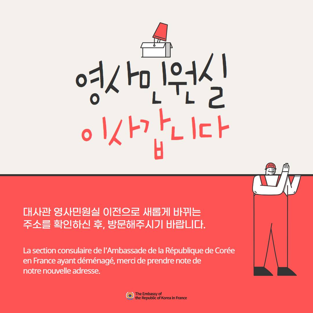 주프랑스한국대사관 영사민원실이 아래 주소로 이전하게 되었음을 알려드립니다.