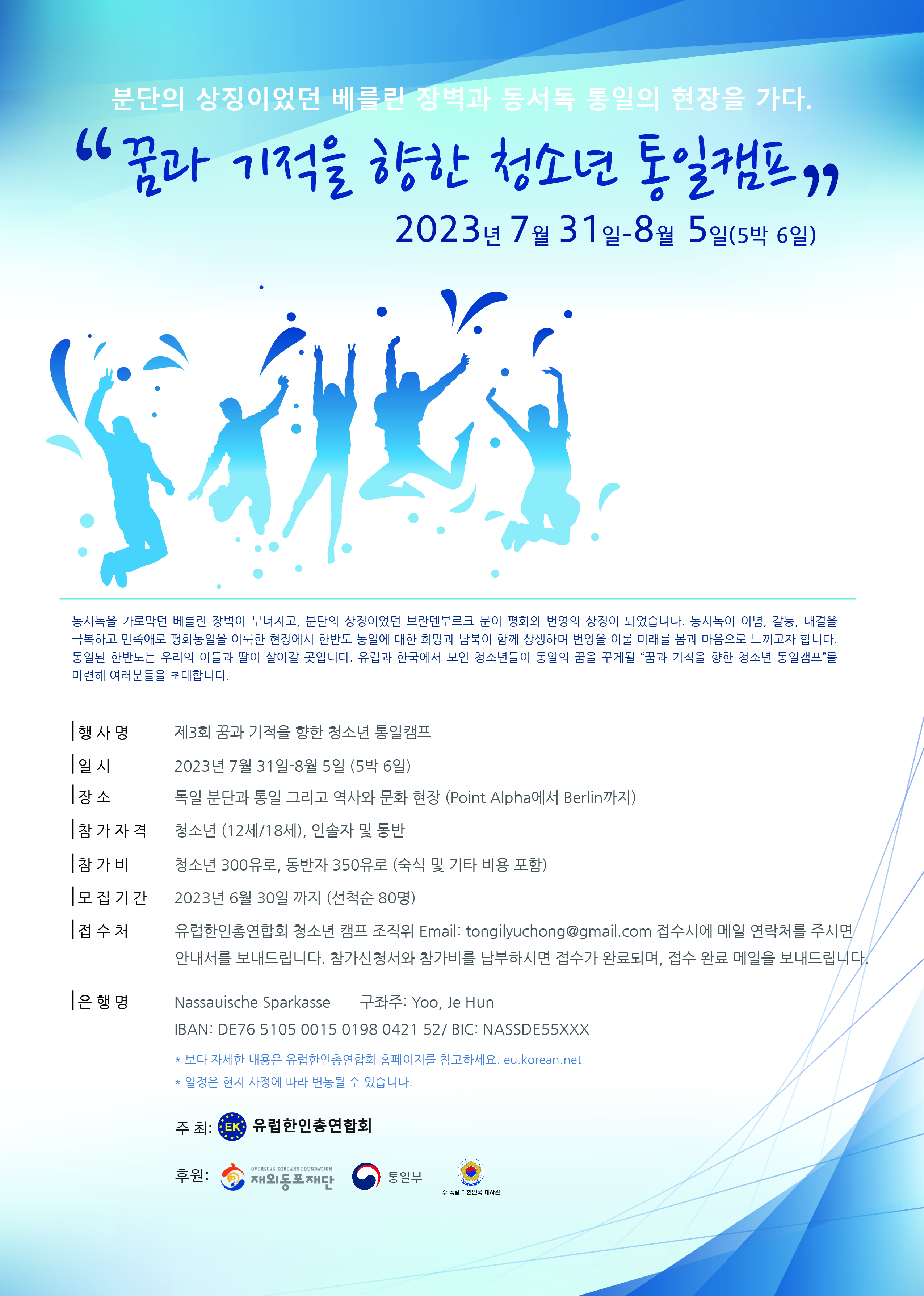 유럽한인총연합회에서는 2023년도 꿈과 기적을 향한 청소년 통일캠프를 개최합니다.