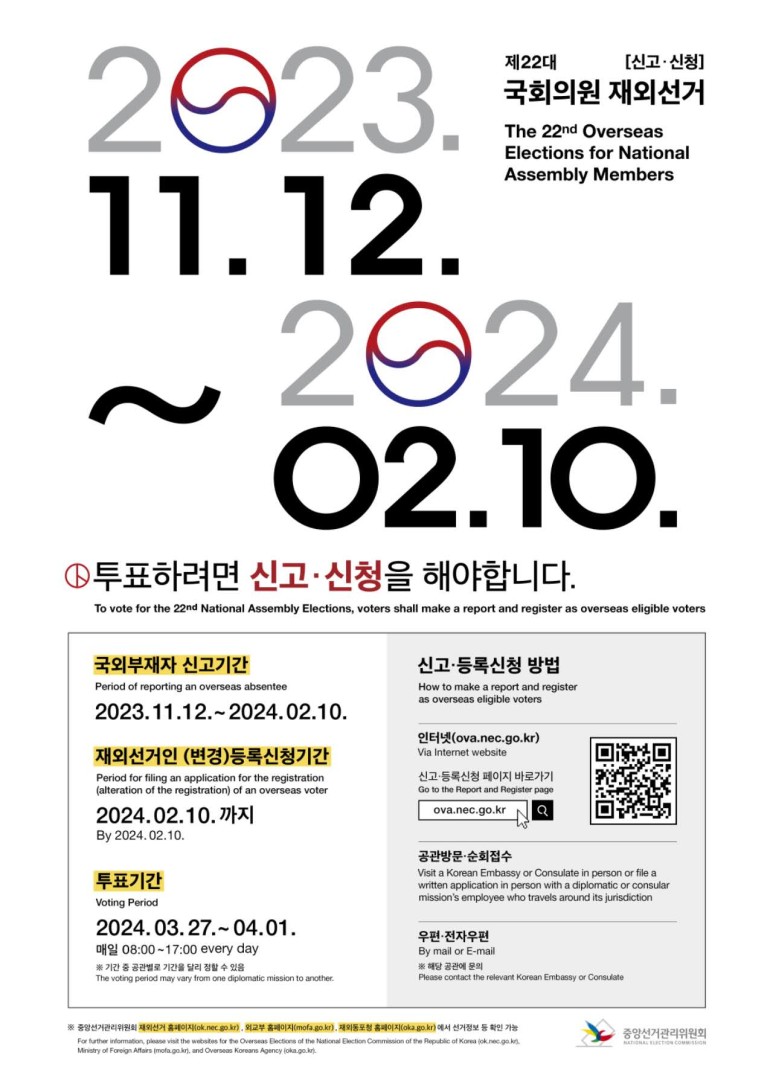 제 22대 국회의원 재외선거 국외부재자/ 재외선거인 신청이 시작되었습니다.