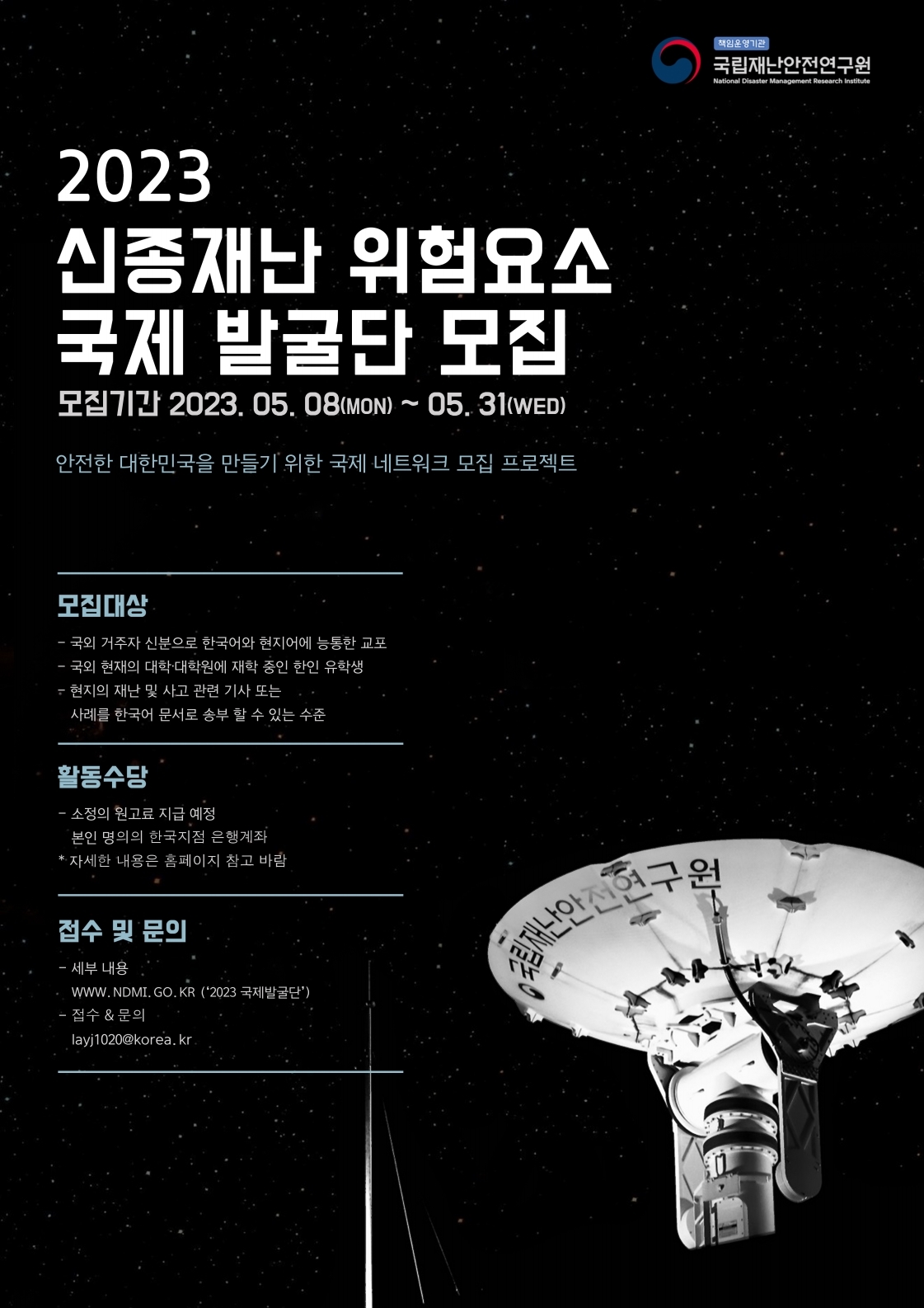 행정안전부 소속기관 국립재난안전연구원에서는 ‘2023 신종재난 위험요소 국제 발굴단’ 모집·운영하고 있습니다.