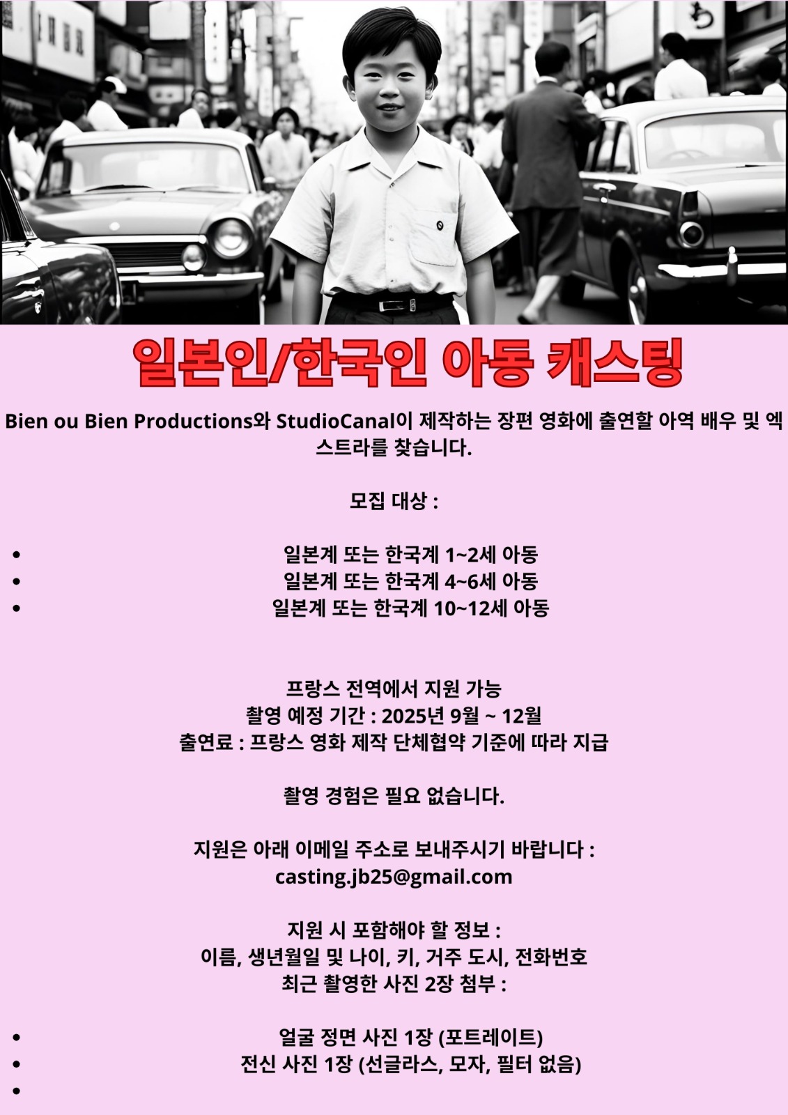 Pour cela, nous cherchons actuellement pour des petits rôles pour jouer les enfants de Joséphine Baker, des enfants coréens, des garçons de 5/6 ans, de 11/12 ans ainsi que des hommes de 23 ans.