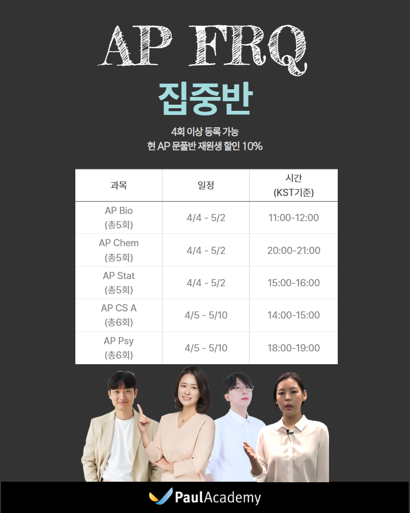제목내용제목+내용글쓴이글쓴이(코) 번호 제목 글쓴이 조회 날짜 377 [유료 SAT 분석 특강] 3월 28일 오후 2시 - 이번 시험, 왜 어려웠을까요? 폴아카데미 49 03-25 376 [폴아카데미4월 세미나-주니어 입시 로드맵] 3년 뒤 미래에서 전하는 주니어 로드맵 세미나 (중도귀국 내용 … F 폴아카데미 54 03-24 열람중 [2026 AP 시험 대비] “3월 MCQ가 준비 되었다면 마지막으로 FRQ에서 점수가 갈립니다.” 4월 F… F 폴아카데미 85 03-20 374 프랑스 이혼 및 양육권 관련 변호사 문의드립니다 (변호사 선임 도움 요청) kjhalan 107 03-17 373 [씨로드] EUX 유럽해상택배 서비스 런칭! F 빙율석 134 03-10 372 [폴아카데미-온라인 세미나] KST 2026.03.17 : SAT 25년 총정리 및 26년 전망 폴아카데미 139 03-06 371 건축사 사무소 fair F 초가집 222 02-16 370 [폴아카데미] 2026 상반기 한국/아시아 대학 입시 온라인 설명회 안내 F 폴아카데미 206 02-12 369 [2026 여름특강] SAT 스케줄 오픈 (단 1주일간 20% 할인 혜택) F 폴아카데미 267 01-23 368 [신년맞이 2025 SAT 기출단어 무료공유] 폴아카데미가 함께합니다. F 폴아카데미 281 01-13 367 [폴아카데미] 2026 SAT 봄학기 정규, 3월 시험대비반 대개강 F 폴아카데미 317 01-06 366 [프랑스 현지 통역 섭외 및 숙소·차량 예약 대행] (기업 전용 · 후불 정산) worldwise 451 12-26 365 [KST 12/27(토) 무료공개강의] 아직은 막연한 개정 TOEFL, 제대로 이해하고 접근하기 폴아카데미 344 12-17 364 통역 서비스 제공 드립니다 ! 75070 777 10-11 363 폴아카데미 25 하반기 한국대학입시 온라인 세미나 폴아카데미 686 09-16 열린1페이지 2페이지 3페이지 4페이지 5페이지 6페이지 7페이지 8페이지 9페이지 10페이지 다음 맨끝