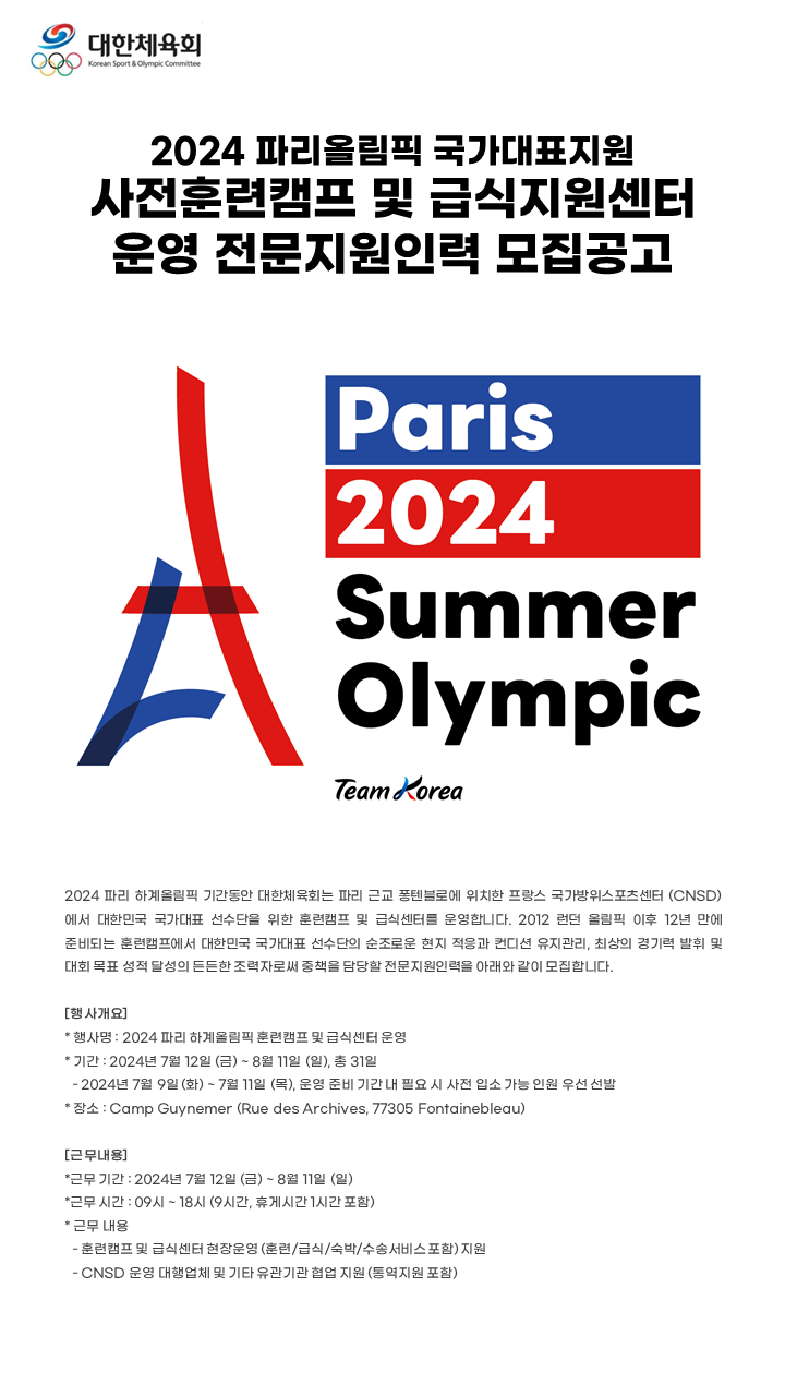 2024 파리 하계올림픽 기간동안 대한체육회는 파리 근교 퐁텐블로에 위치한 프랑스 국가방위스포츠센터 (CNSD) 에서
