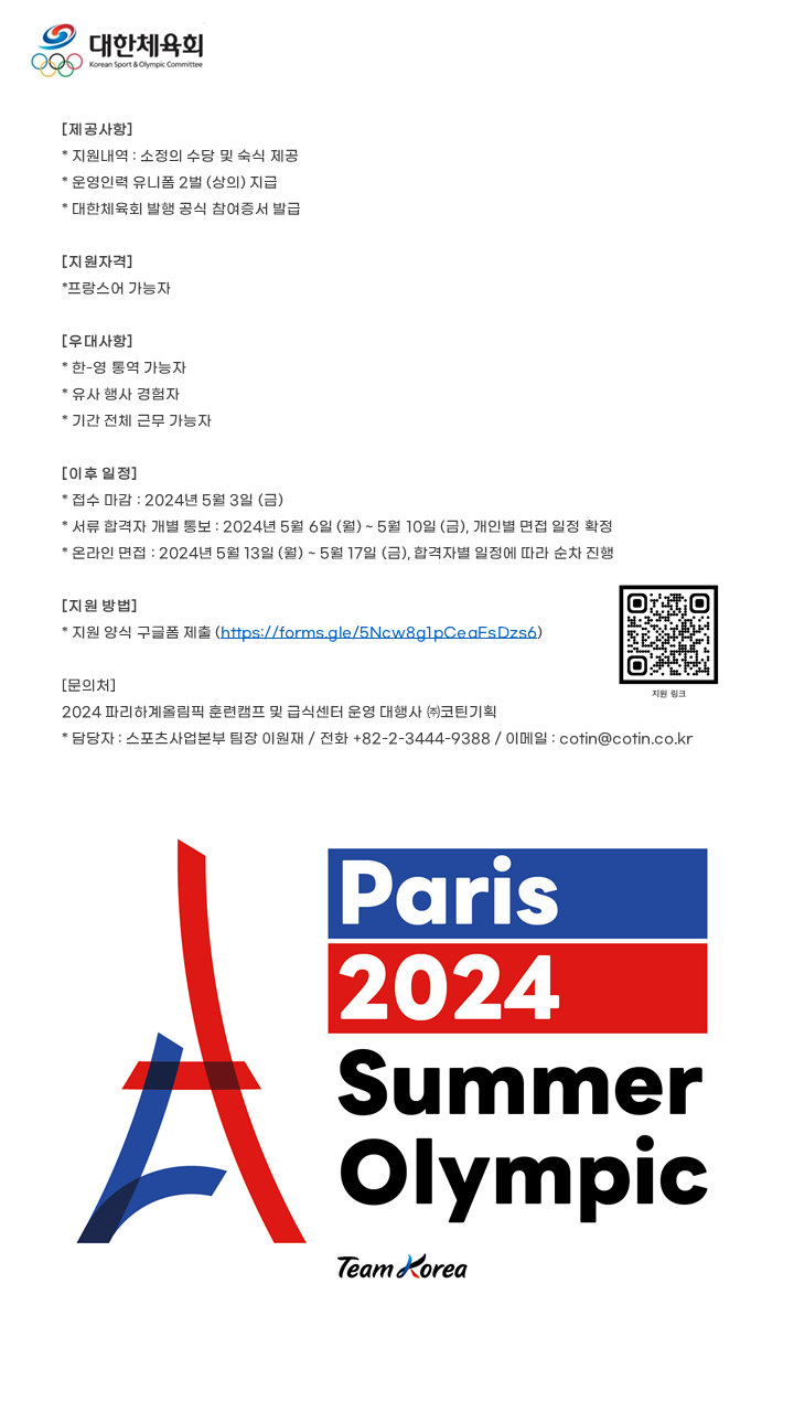 안녕하세요, 2024 파리하계올림픽 국가대표 지원 사전훈련캠프 및 급식지원센터 공식 운영대행사 코틴기획입니다.
