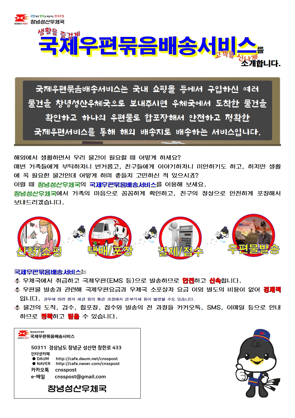 그리고 다음(DAUM)과 네이버(NAVER)에 창녕성산우체국 카페(카페에서 '창녕성산우체국' 검색)가 있습니다. 인터넷 카페를 방문하시면 국제우편가 관련된 정보를 보실 수 있습니다.