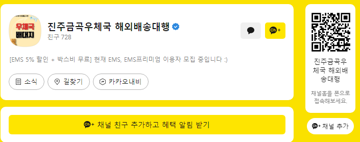 카카오톡 채널 "진주금곡우체국" 검색해 문의주시면 친절히 안내드리겠습니다! 좋은 하루되세요 :)