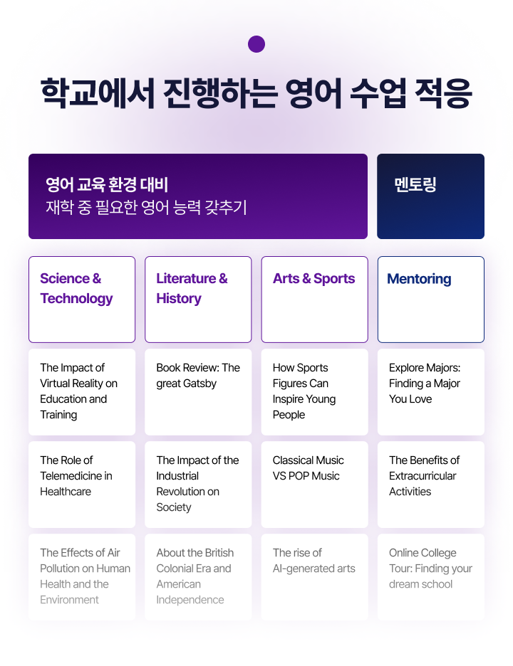 - 70+ 개 이상 Global / Politics / Science / technology / Literature / Social issues 등 국제학교 과정에서 도움이 되는 주제들로 토론/교정 및 정교한 피드백를 제공합니다.