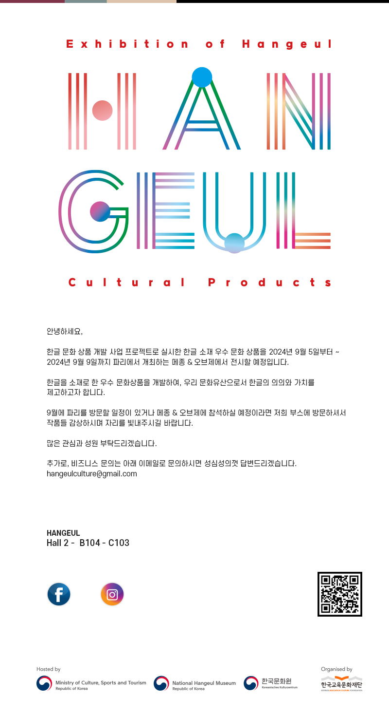 한글 문화 상품 개발 사업 프로젝트로 실시한 한글 소재 우수 문화 상품을 2024년 9월 5일부터 ~ 2024년 9월 9일까지 파리에서 개최하는 메종 & 오브제에서 전시할 예정입니다.
