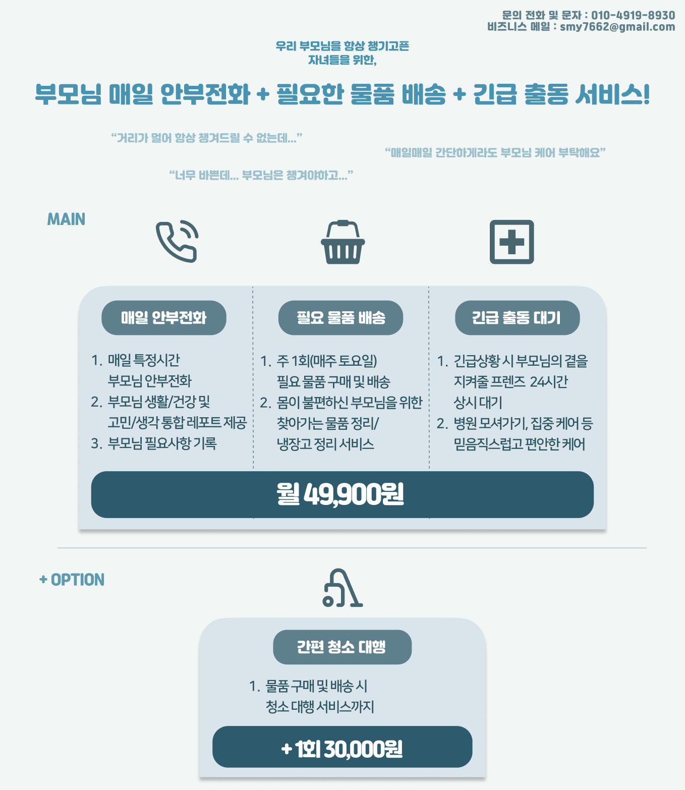 - 매일 부모님들께 먼저 전화를 드려 안부를 확인하고 필요한 것을 여쭤봅니다.