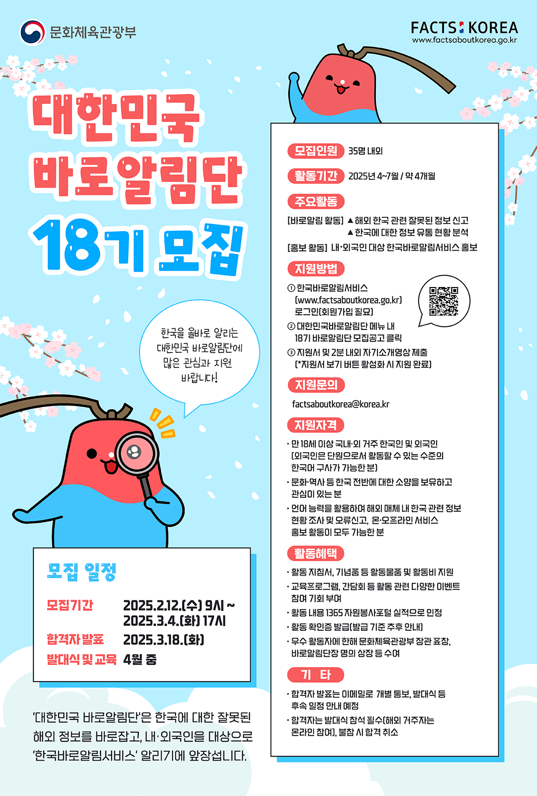 해외에서 발견한 한국에 대한 잘못된 정보를 바로잡고, 한국을 올바로 알리기 위해 활동하는‘대한민국 바로알림단’을 모집합니다!