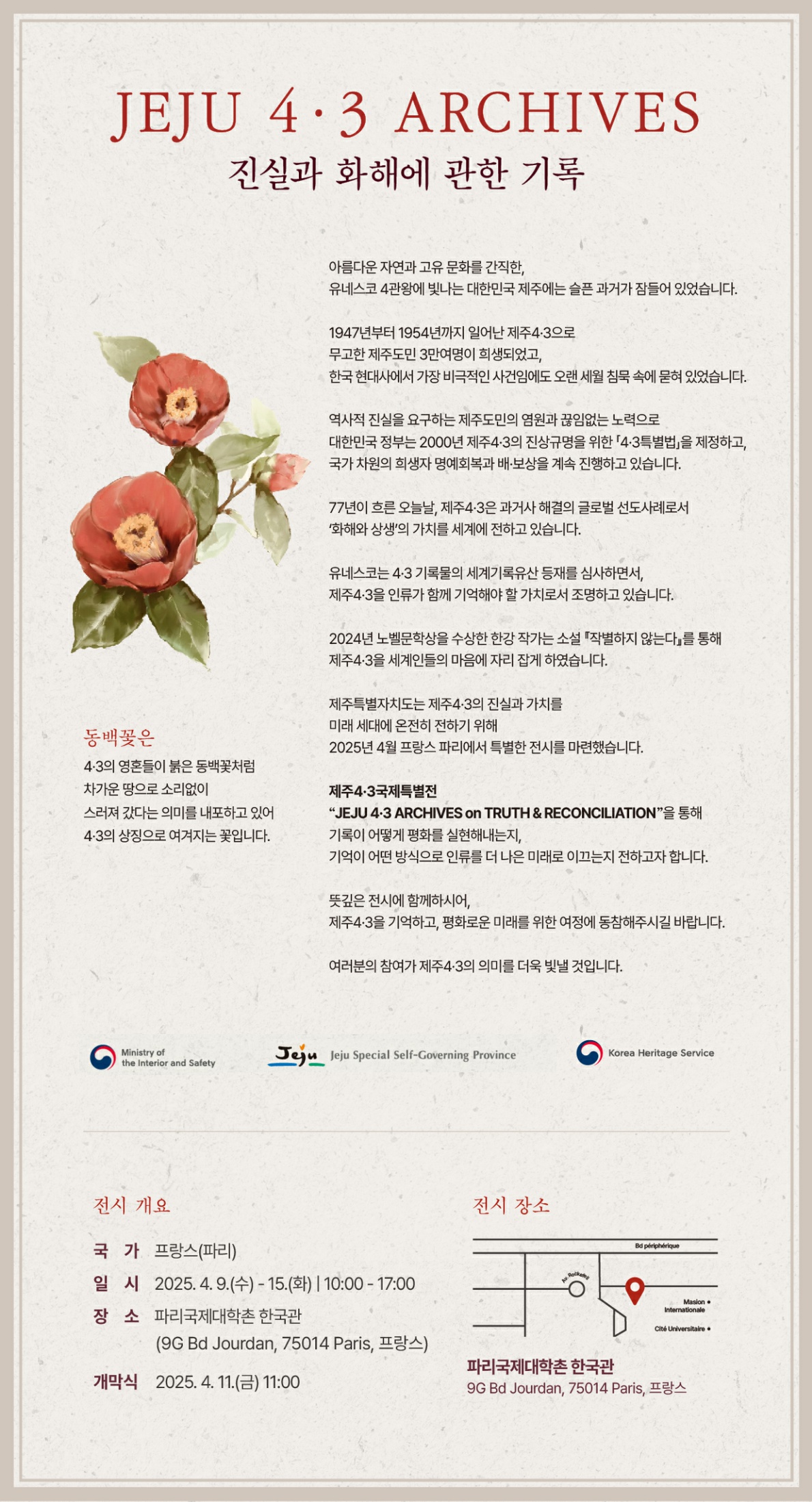 [무료전시] 유네스코 세계기록유산 등재를 위한 제주4·3국제 특별전 개최 (4/9~15, 파리국제대학촌 한국관 다목적실)