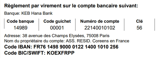 회비나 후원금을 보내주시는 방법은 한인회 사무실 (ARCF - 83 rue de la Croix Nivert, 75015 Paris) 로 수표를 보내주시 거나, 아래의 계좌로 송금하실 수 있습니다.
