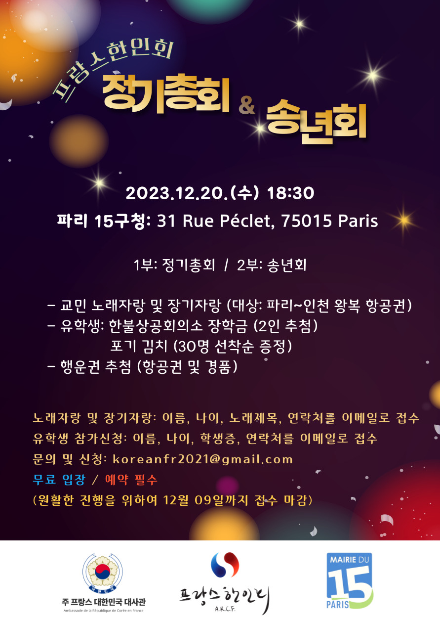 제목내용제목+내용글쓴이글쓴이(코) 번호 제목 글쓴이 조회 날짜 21 프랑스 한글학교 학생 모집 F 한인회 1647 08-28 20 [2024.09.13~15] 2024 한가위 축제 F 한인회 2237 08-16 19 프랑스 한글학교 F 한인회 1483 07-19 18 [2024년6월29일 마감] 생시르 프랑스 육군사관학교 대한민국 연수 후원 모금 F 한인회 1514 06-10 17 [2024년도] 한인회 강좌 사물놀이 F 한인회 1495 05-30 16 [2024-05-01] 2024 프랑스 한인회 체육대회 F 한인회 2312 04-03 15 [2024-03-01] 105주년 삼일절 기념식 F 한인회 1898 02-13 14 [2024년도] 프랑스 한인회 회원을 위한 강좌 (생활불어, 합창) F 한인회 2013 01-16 열람중 [2023-12-20] 프랑스 한인회 정기총회 & 송년회 F 한인회 2276 11-09 12 [2023-09-16,17] 2023 프랑스 한가위 축제 F 한인회 2734 09-01 11 [2023-08-15] 제78주년 광복절 기념식 F 한인회 3036 07-10 10 [2023-06-23] 정전 70주년 6.25 행사 F 한인회 3010 06-19 9 [2023-05-08] 한인 체육대회 F 한인회 3364 04-13 8 [상시모집] 생활불어 무료 아뜰리에 F 한인회 3047 03-28 7 [2023-03-01] 104주년 삼일절 기념식 F 한인회 2907 03-28 처음 1페이지 열린2페이지 3페이지 맨끝