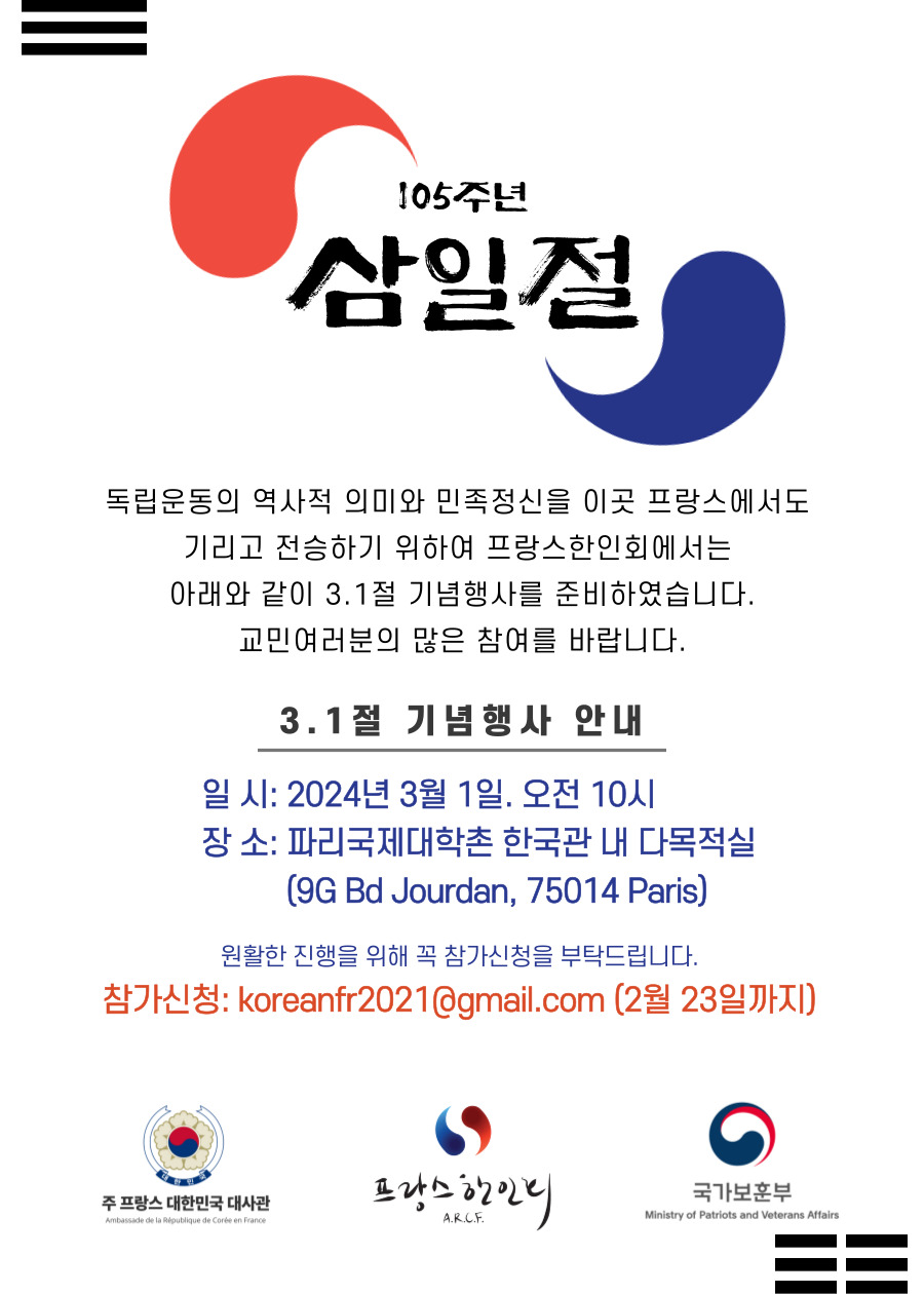 제목내용제목+내용글쓴이글쓴이(코) 번호 제목 글쓴이 조회 날짜 21 프랑스 한글학교 학생 모집 F 한인회 1646 08-28 20 [2024.09.13~15] 2024 한가위 축제 F 한인회 2236 08-16 19 프랑스 한글학교 F 한인회 1482 07-19 18 [2024년6월29일 마감] 생시르 프랑스 육군사관학교 대한민국 연수 후원 모금 F 한인회 1513 06-10 17 [2024년도] 한인회 강좌 사물놀이 F 한인회 1494 05-30 16 [2024-05-01] 2024 프랑스 한인회 체육대회 F 한인회 2312 04-03 열람중 [2024-03-01] 105주년 삼일절 기념식 F 한인회 1898 02-13 14 [2024년도] 프랑스 한인회 회원을 위한 강좌 (생활불어, 합창) F 한인회 2012 01-16 13 [2023-12-20] 프랑스 한인회 정기총회 & 송년회 F 한인회 2275 11-09 12 [2023-09-16,17] 2023 프랑스 한가위 축제 F 한인회 2734 09-01 11 [2023-08-15] 제78주년 광복절 기념식 F 한인회 3035 07-10 10 [2023-06-23] 정전 70주년 6.25 행사 F 한인회 3010 06-19 9 [2023-05-08] 한인 체육대회 F 한인회 3363 04-13 8 [상시모집] 생활불어 무료 아뜰리에 F 한인회 3046 03-28 7 [2023-03-01] 104주년 삼일절 기념식 F 한인회 2906 03-28 처음 1페이지 열린2페이지 3페이지 맨끝