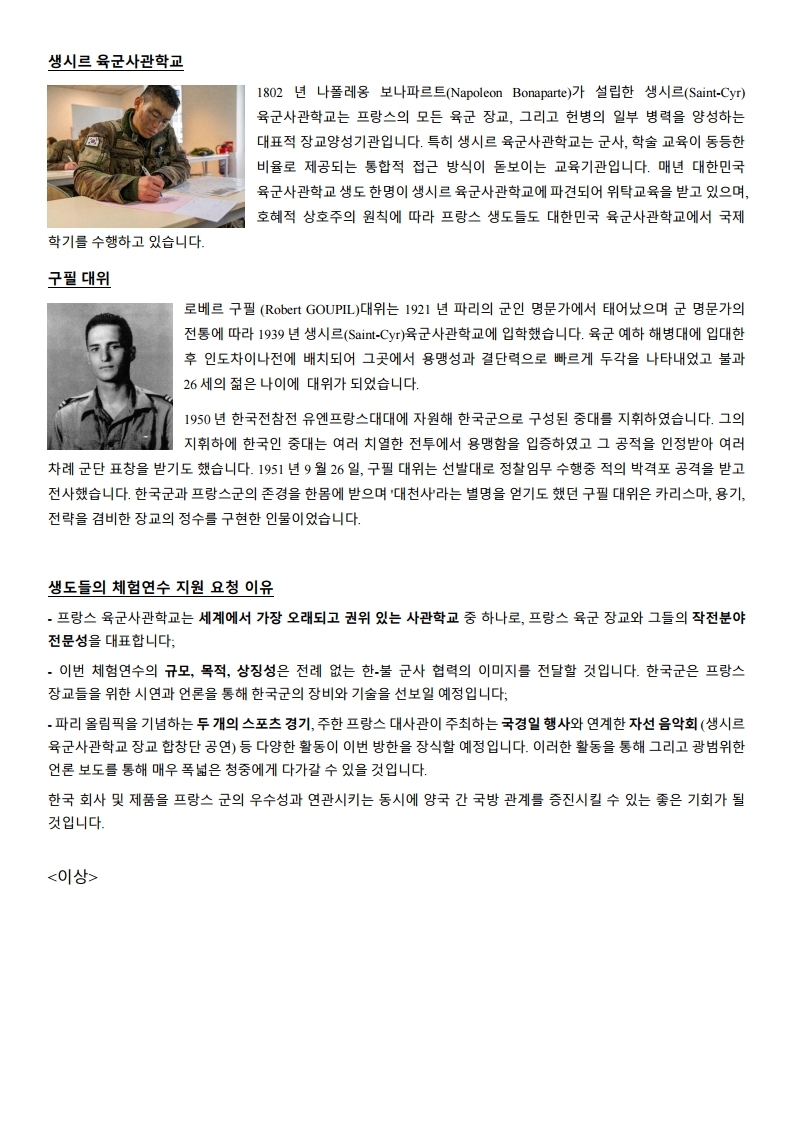 제목 : 생시르 프랑스 육군사관학교 제 209 기 생도 (2022 Promotion / 일명 : « 구필 » 대위 기수) 대한민국 연수 후원요청