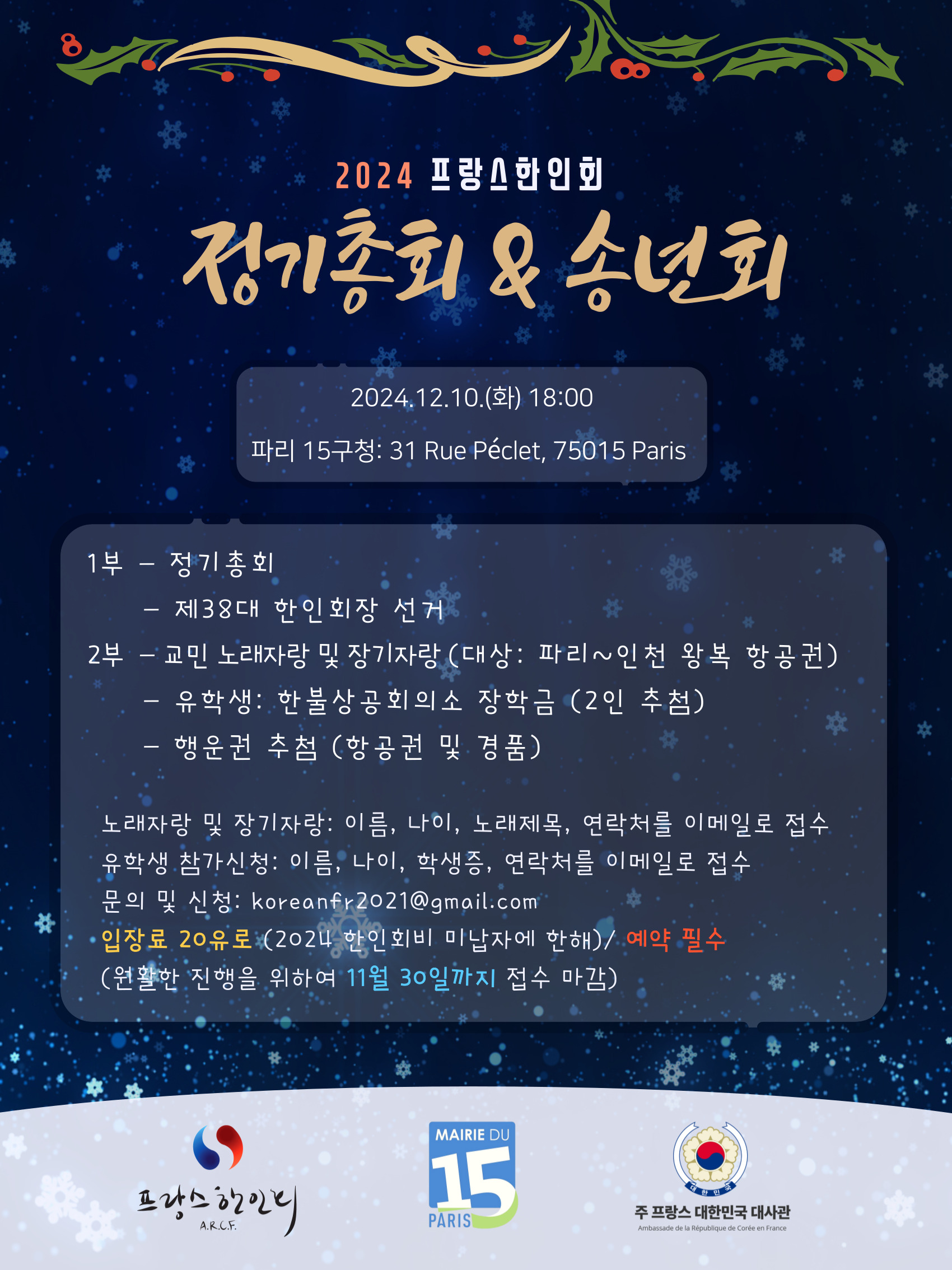 제목내용제목+내용글쓴이글쓴이(코) 번호 제목 글쓴이 조회 날짜 36 2025 정기총회 및 송년회 F 한인회 219 11-20 35 프랑스 한인사회의 뿌리를 찾아서 F 한인회 239 10-30 34 2025 한가위 축제 F 한인회 914 08-12 33 80주년 광복절 기념식 F 한인회 663 07-10 32 [2025.08.15] 임시총회 공고 F 한인회 599 07-10 31 파리 15 한글학교 학생모집 F 한인회 659 06-03 30 프랑스 한인 체육대회 F Admin 997 04-04 29 106주년 삼일절 기념 F 한인회 1088 02-03 28 삼일절 기념 차세대 웅변대회 F 한인회 1008 02-03 27 제38대 프랑스 한인회장 선거 후보자 확정 공고 F 한인회 1338 11-19 열람중 2024 프랑스 한인회 정기총회 & 송년회 F 한인회 1252 11-15 25 Re: 2024 프랑스 한인회 정기총회 & 송년회 fsdfsddd32 766 05-23 24 Re: Re: 2024 프랑스 한인회 정기총회 & 송년회 fsdfsddd32 686 05-23 23 [2024.11.11] 프랑스 한인사회의 뿌리를 찾아서 F 한인회 1298 10-18 22 제38대 프랑스한인회장 입후보자 등록안내 F 한인회 1128 10-14 열린1페이지 2페이지 3페이지 맨끝