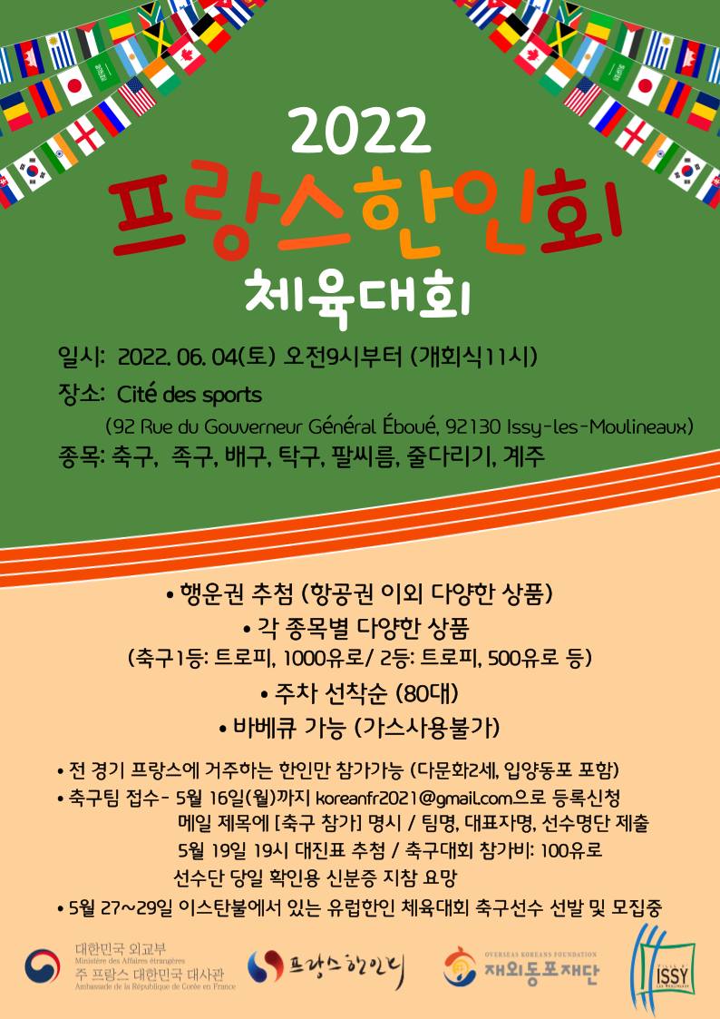 제목내용제목+내용글쓴이글쓴이(코) 번호 제목 글쓴이 조회 날짜 6 [2022-12-16] 2022 정기총회 & 송년회 F 한인회 2901 03-28 5 [2022-11-11] 홍재하 지사 봉환 모금 현황 한인회 2719 03-28 4 [2022-09-17,18] 2022 코리안 페스티벌 F 한인회 2810 03-28 3 [2022-08-15] 제 77주년 8.15 광복절 기념행사 F 한인회 2727 03-28 2 [2022-06-14] 한국 미술의 정체성 - 유홍준교수 강연 F 한인회 2736 03-28 열람중 [2022-06-04] 2022 프랑스 한인회 체육대회 F 한인회 2847 03-28 처음 1페이지 2페이지 열린3페이지