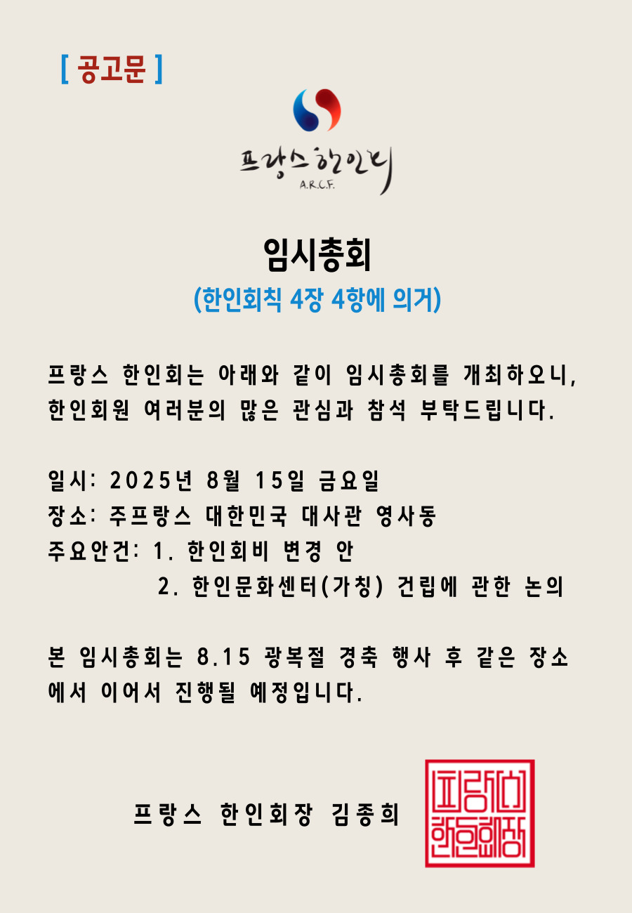 제목내용제목+내용글쓴이글쓴이(코) 번호 제목 글쓴이 조회 날짜 36 2025 정기총회 및 송년회 F 한인회 219 11-20 35 프랑스 한인사회의 뿌리를 찾아서 F 한인회 239 10-30 34 2025 한가위 축제 F 한인회 914 08-12 33 80주년 광복절 기념식 F 한인회 663 07-10 열람중 [2025.08.15] 임시총회 공고 F 한인회 599 07-10 31 파리 15 한글학교 학생모집 F 한인회 659 06-03 30 프랑스 한인 체육대회 F Admin 997 04-04 29 106주년 삼일절 기념 F 한인회 1088 02-03 28 삼일절 기념 차세대 웅변대회 F 한인회 1008 02-03 27 제38대 프랑스 한인회장 선거 후보자 확정 공고 F 한인회 1338 11-19 26 2024 프랑스 한인회 정기총회 & 송년회 F 한인회 1251 11-15 25 Re: 2024 프랑스 한인회 정기총회 & 송년회 fsdfsddd32 766 05-23 24 Re: Re: 2024 프랑스 한인회 정기총회 & 송년회 fsdfsddd32 686 05-23 23 [2024.11.11] 프랑스 한인사회의 뿌리를 찾아서 F 한인회 1298 10-18 22 제38대 프랑스한인회장 입후보자 등록안내 F 한인회 1128 10-14 열린1페이지 2페이지 3페이지 맨끝