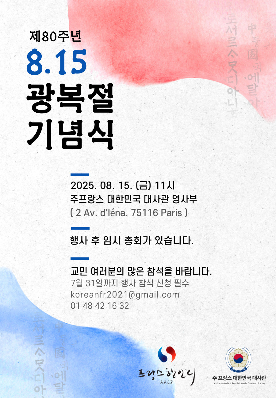 제목내용제목+내용글쓴이글쓴이(코) 번호 제목 글쓴이 조회 날짜 36 2025 정기총회 및 송년회 F 한인회 219 11-20 35 프랑스 한인사회의 뿌리를 찾아서 F 한인회 239 10-30 34 2025 한가위 축제 F 한인회 914 08-12 열람중 80주년 광복절 기념식 F 한인회 663 07-10 32 [2025.08.15] 임시총회 공고 F 한인회 598 07-10 31 파리 15 한글학교 학생모집 F 한인회 659 06-03 30 프랑스 한인 체육대회 F Admin 997 04-04 29 106주년 삼일절 기념 F 한인회 1088 02-03 28 삼일절 기념 차세대 웅변대회 F 한인회 1008 02-03 27 제38대 프랑스 한인회장 선거 후보자 확정 공고 F 한인회 1338 11-19 26 2024 프랑스 한인회 정기총회 & 송년회 F 한인회 1251 11-15 25 Re: 2024 프랑스 한인회 정기총회 & 송년회 fsdfsddd32 766 05-23 24 Re: Re: 2024 프랑스 한인회 정기총회 & 송년회 fsdfsddd32 686 05-23 23 [2024.11.11] 프랑스 한인사회의 뿌리를 찾아서 F 한인회 1298 10-18 22 제38대 프랑스한인회장 입후보자 등록안내 F 한인회 1128 10-14 열린1페이지 2페이지 3페이지 맨끝