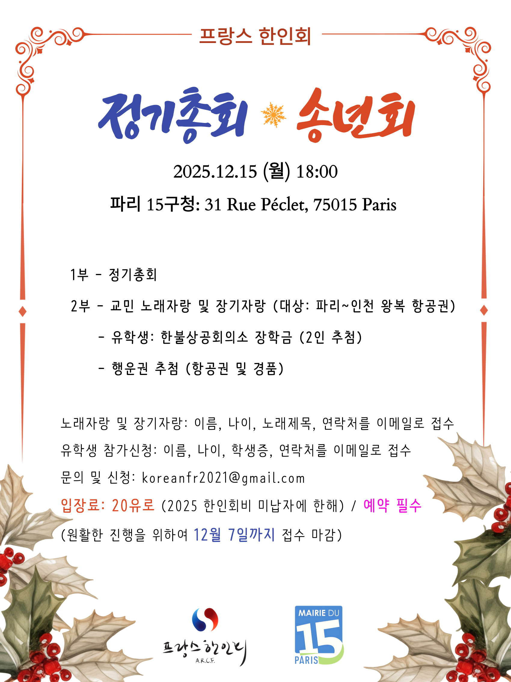 제목내용제목+내용글쓴이글쓴이(코) 번호 제목 글쓴이 조회 날짜 열람중 2025 정기총회 및 송년회 F 한인회 219 11-20 35 프랑스 한인사회의 뿌리를 찾아서 F 한인회 239 10-30 34 2025 한가위 축제 F 한인회 914 08-12 33 80주년 광복절 기념식 F 한인회 662 07-10 32 [2025.08.15] 임시총회 공고 F 한인회 598 07-10 31 파리 15 한글학교 학생모집 F 한인회 659 06-03 30 프랑스 한인 체육대회 F Admin 996 04-04 29 106주년 삼일절 기념 F 한인회 1088 02-03 28 삼일절 기념 차세대 웅변대회 F 한인회 1008 02-03 27 제38대 프랑스 한인회장 선거 후보자 확정 공고 F 한인회 1338 11-19 26 2024 프랑스 한인회 정기총회 & 송년회 F 한인회 1251 11-15 25 Re: 2024 프랑스 한인회 정기총회 & 송년회 fsdfsddd32 766 05-23 24 Re: Re: 2024 프랑스 한인회 정기총회 & 송년회 fsdfsddd32 686 05-23 23 [2024.11.11] 프랑스 한인사회의 뿌리를 찾아서 F 한인회 1298 10-18 22 제38대 프랑스한인회장 입후보자 등록안내 F 한인회 1128 10-14 열린1페이지 2페이지 3페이지 맨끝