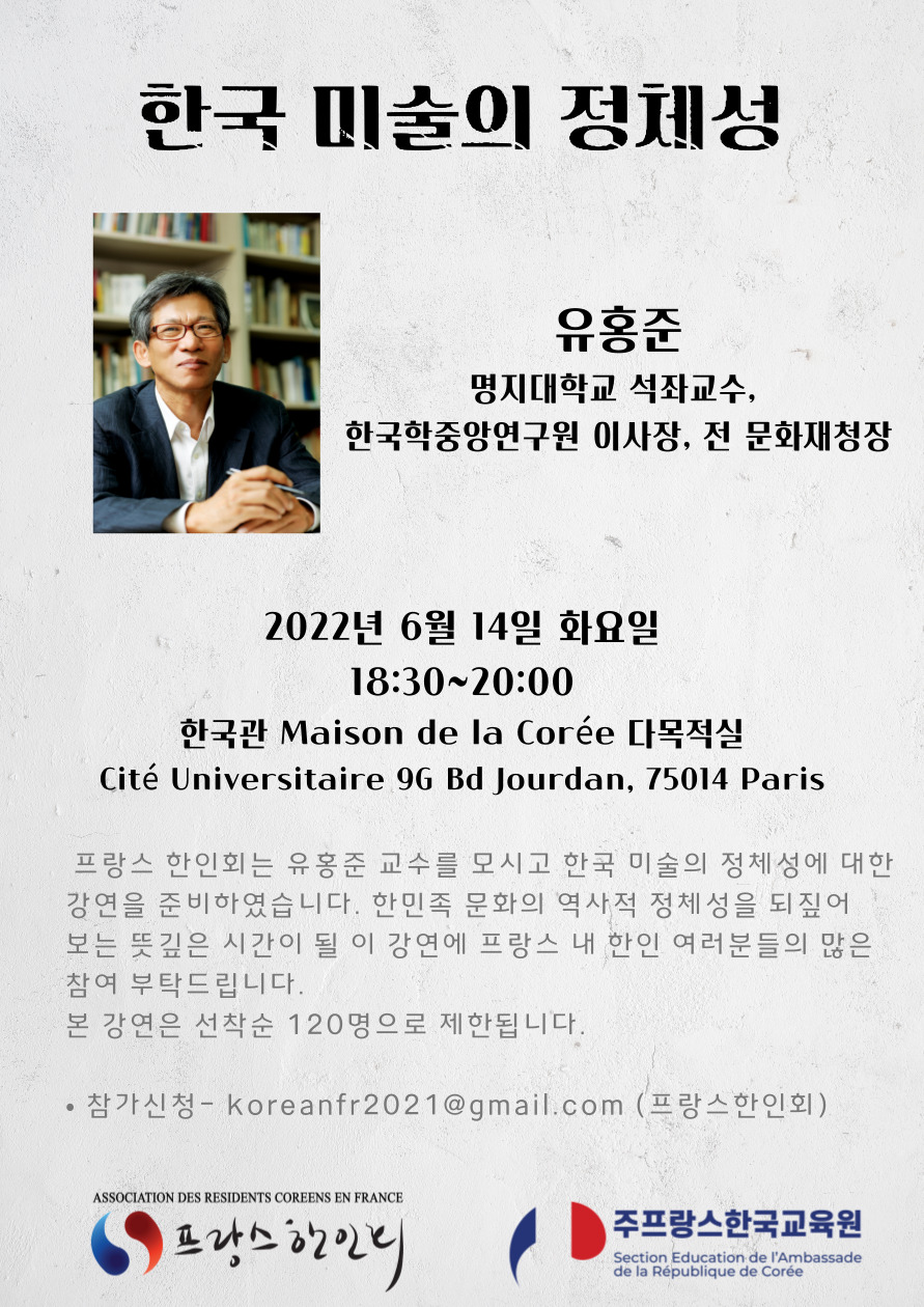 제목내용제목+내용글쓴이글쓴이(코) 번호 제목 글쓴이 조회 날짜 6 [2022-12-16] 2022 정기총회 & 송년회 F 한인회 2900 03-28 5 [2022-11-11] 홍재하 지사 봉환 모금 현황 한인회 2719 03-28 4 [2022-09-17,18] 2022 코리안 페스티벌 F 한인회 2810 03-28 3 [2022-08-15] 제 77주년 8.15 광복절 기념행사 F 한인회 2727 03-28 열람중 [2022-06-14] 한국 미술의 정체성 - 유홍준교수 강연 F 한인회 2736 03-28 1 [2022-06-04] 2022 프랑스 한인회 체육대회 F 한인회 2846 03-28 처음 1페이지 2페이지 열린3페이지