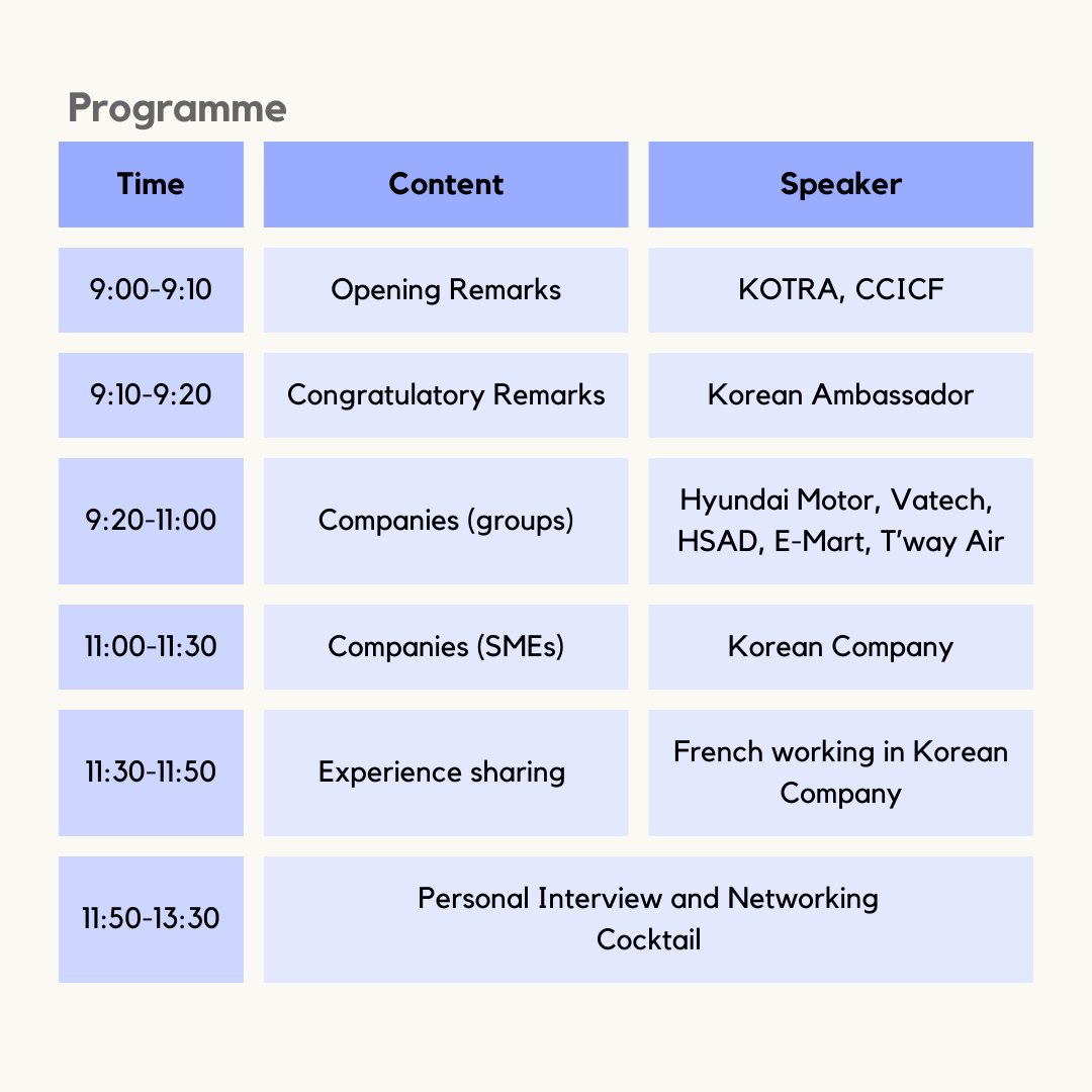 2024년 5월 28일 대사관과 코트라와 함께 프랑스 및 한국 학생들을 대상으로 채용설명회가 개최될 예정입니다.