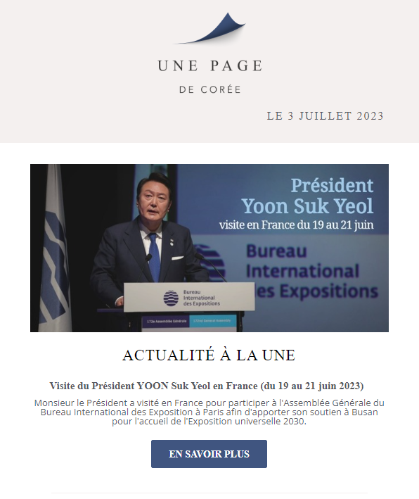 communicationfr@mofa.go.kr (Titre du message : S'inscrire à la newsletter).
